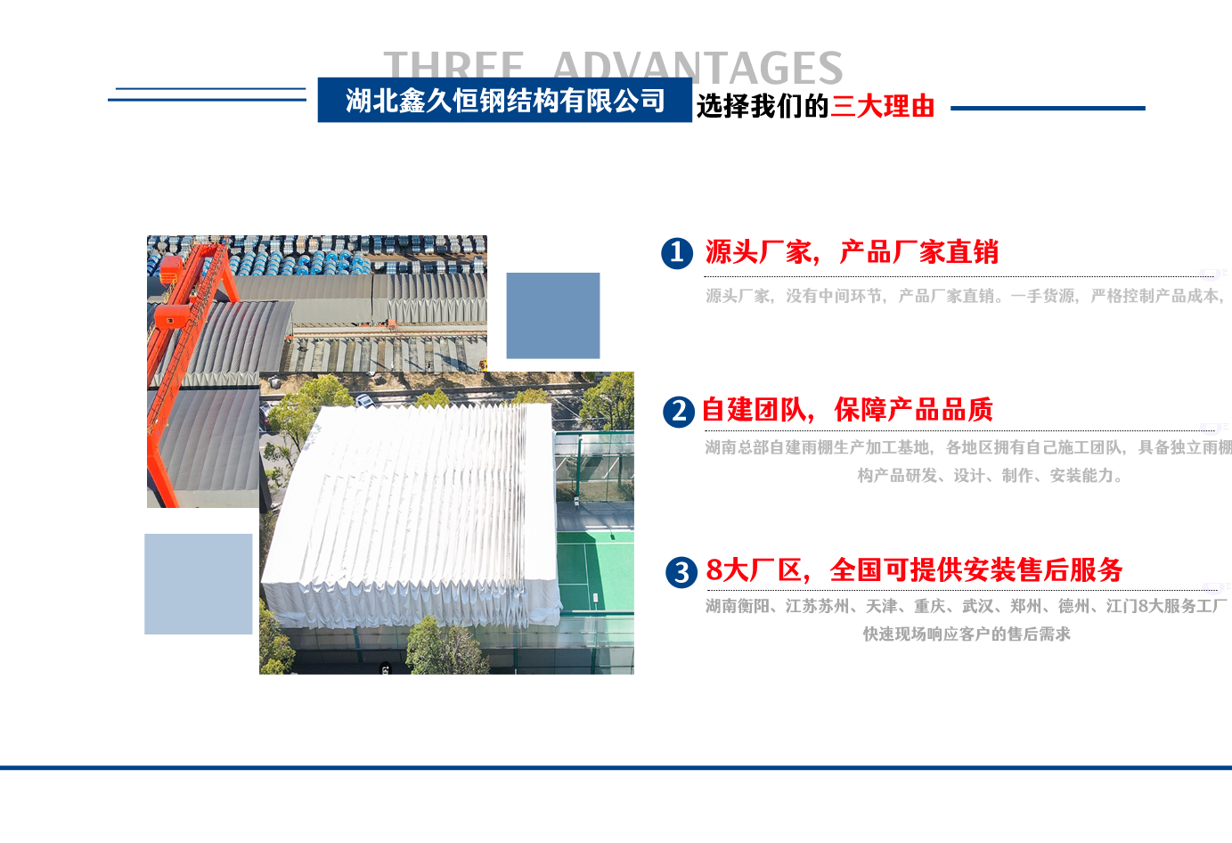 湖北鑫久恒鋼結構有限公司是一家電動雨棚、膜結構車棚研發,生產銷售,施工安裝于一體的專業鋼結構科技公司,主要產品有伸縮雨棚,電動雨棚,膜結構車棚等?! 『系貐^職員目前有80多人,占地面積20000平方米,廠房面積15600平方米,配備先進的生產流水線,使每件品質產品的堅實基礎。 公司在蘇州、天津、重慶、武漢、德州、烏魯木齊、江門均設有服務工廠,總人員共300多人,擁有專業的技術團隊,配備先進的設備和流水線生產,產能高,貨源充足,發貨速度快,服務區域廣?! ∫苿由炜s棚適用于通道臨時倉儲、戶外運動遮陽、污水池遮蓋、能源交通、熱力化工、礦山、船舶制造及市政建設、物流、碼頭等領域的構件制作加工,成品半成品存放、倉庫、野外儀器設備操作用房等。尤其是對工廠發貨、倉儲臨時遮雨防嗮,梅雨期較長、建設周期較短的工程施工等特別適用。還可根據用戶需求量身定制、適合企業所需不同款式的產品?! ∥夜緢猿帧罢\信社會為本,客戶滿意為榮”的經營理念,做到質量把控,嚴格管理,精益求精,恪守承諾。使鑫久恒逐步走向成熟,其系統化、專業化日趨完善。以專業的技術、科學的管理,更高的產品質量,優良的企業信譽,真誠的客戶服務,靈活多樣的經營方式和務實創新的企業精神愿與社會各界攜手合作,為推動智能鋼結構建筑事業的發展而不斷努力。...